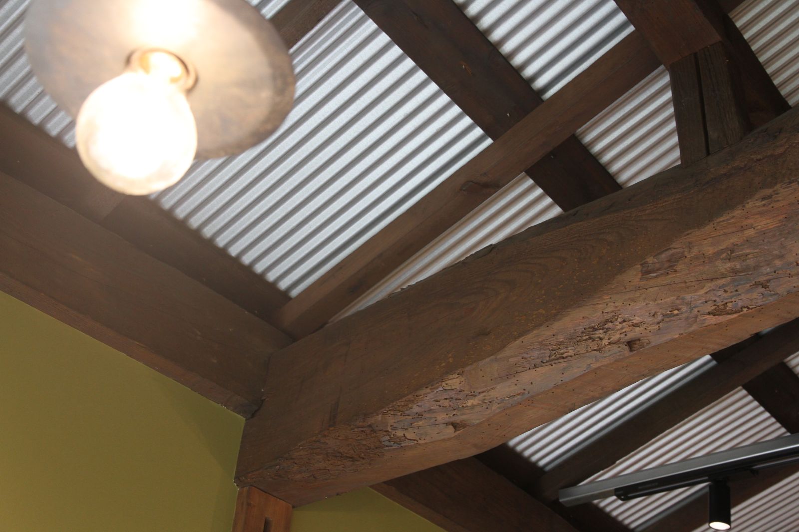 目指したのは、子どもからご年配の方まで気軽に立ち寄れる、落ち着いた空間。既存の古い梁をそのまま生かし、天井をあらわしに。裸電球のやさしい灯りが、小屋全体を包み込みます。